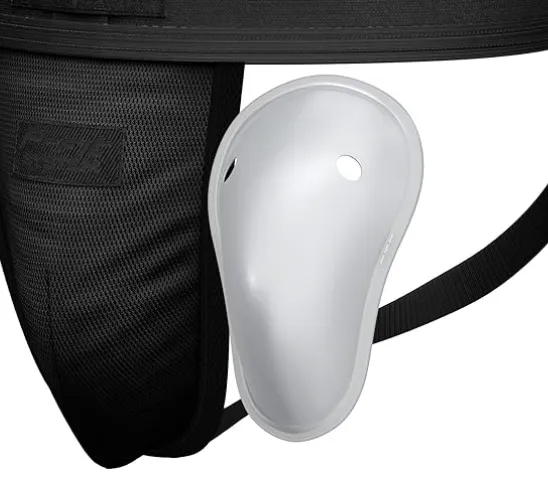 worn over the groin area to prevent injuries from accidental low blows, kicks, and strikes.